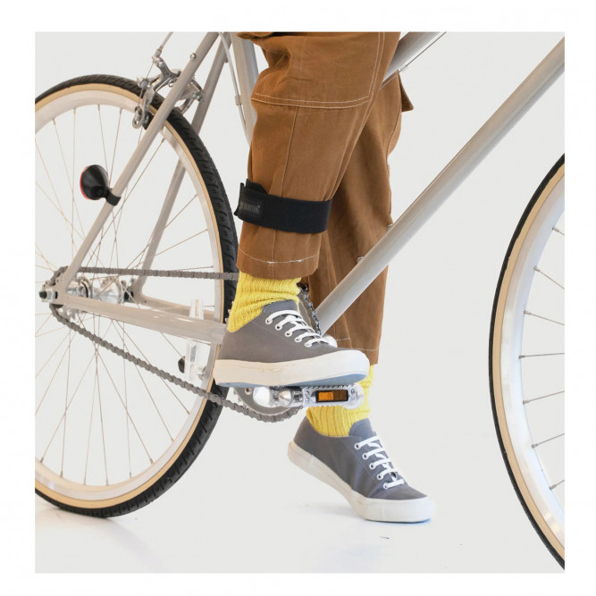 Stahovací páska od firmy Blue Lug na ochranu kalhot při jízdě na kole. Snadno se přizpůsobí a zabraňuje zašpinění kalhot o řetěz či převodník.